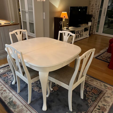 Spisestuen har seks stoler og bord med tre ileggsplater. De er ikke sandblåst og har annen farge enn bordet.