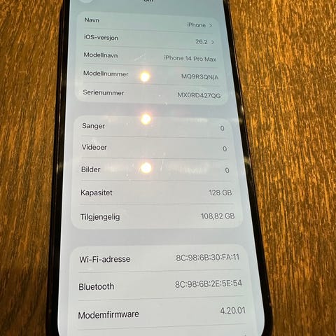 Apple iPhone 14 Pro Max mobiltelefon med 256 GB lagringsplass. Modellen har stor skjerm med heldekkende front og trippelt kamerasystem på baksiden. Telefonen på bildene vises med deksel og lader med kabel, som kan følge med etter avtale. Egner seg for brukere som trenger god lagringskapasitet til apper, bilder og video.