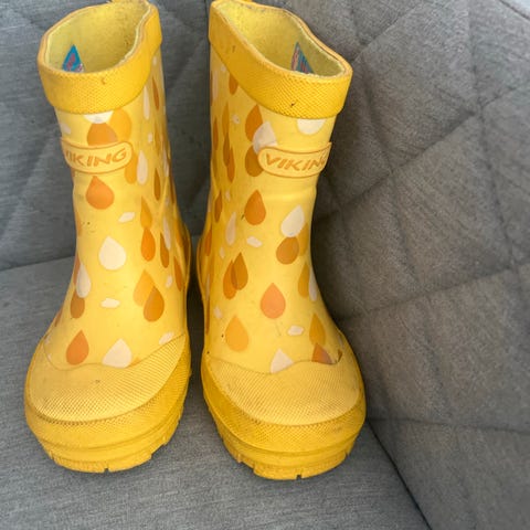 Viking gummistøvler for barn i størrelse 21. Unisex-modell i gul farge med mønster. Støvlene er laget i vanntett materiale med grov såle som gir godt grep. Egnet til bruk i regnvær og vått underlag for mindre barn.