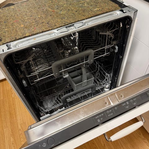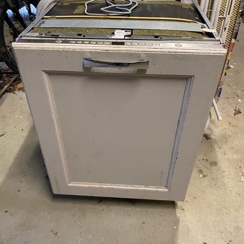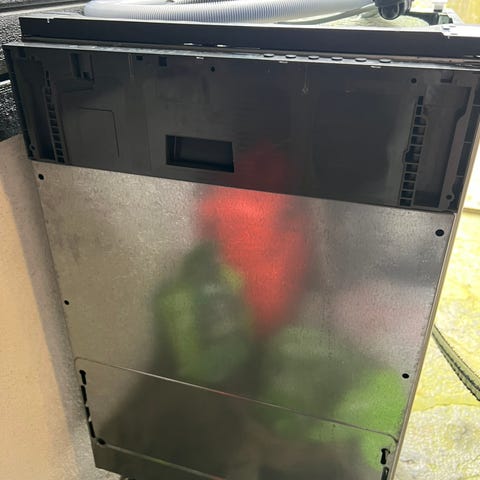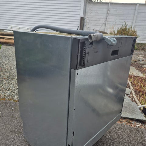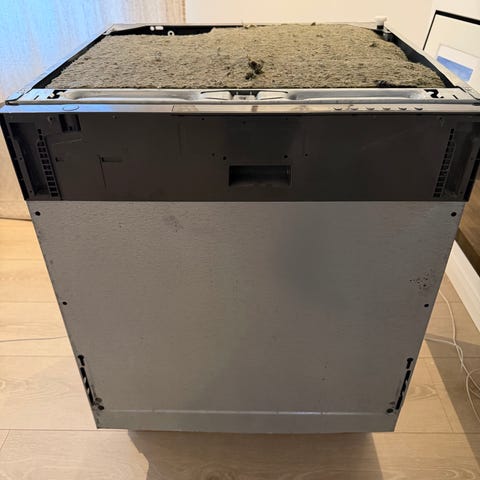 Integrert modell som bygges inn i kjøkkeninnredningen. Maskinen leveres uten frontplate, slik at den kan tilpasses kjøkkenet. Tilkoblingsslanger og strømledning følger med, men bildene viser synlige skader (Fra rotte) som kreves utskifting eller reparasjon før bruk.