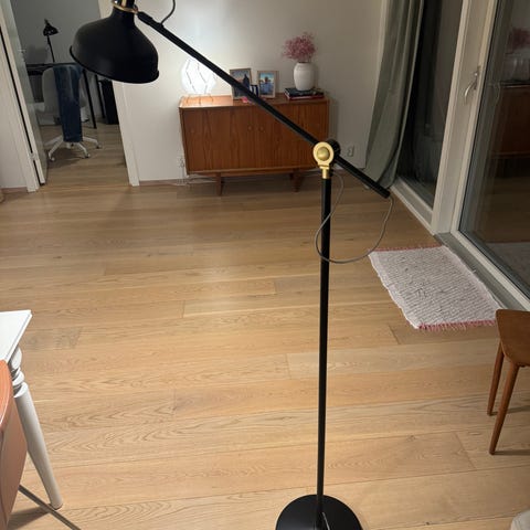 IKEA skrivebordslampe i svart metall. Lampen har justerbar arm og skjerm, slik at lyset kan rettes etter behov på skrivebord eller arbeidsplass. Klassisk bordlampe som passer på kontor, arbeidsrom eller som leselampe.