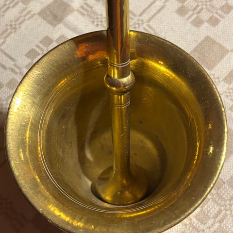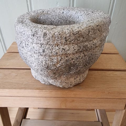Håndlagd stein morter selges kr 1200,- pluss eventuell porto kr 129,- med PostNord. Ca 17x18 målt oppe, ca 14 cm målt på tvers under, ca 14 cm høy. Ca 5,7 kg. Er brukt til lysestake eller vase til små planter f eks svibel.