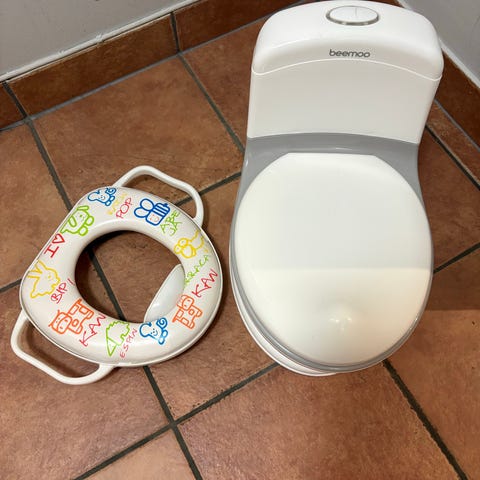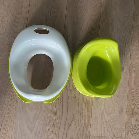 Fisher-Price potte med lyd i hvit og blå plast. Utformet som et lite toalett med lokk, sete og innvendig potte som kan tas ut for enkel rengjøring. Har håndtak på siden og enkel betjening for barnet. Egnet til bruk ved do- og pottetrening av små barn.