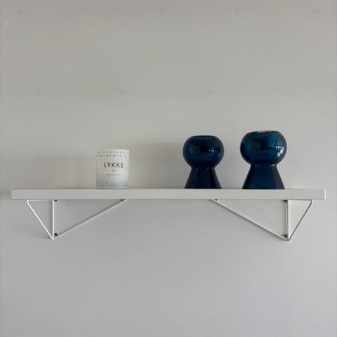 De trekantformede konsollene kan festes på fire forskjellige måter, noe som gir fleksibel design og leken geometri. Konsollene er laget i pulverlakkert stålkfil for stabilitet og lang holdbarhet. To festebraketter medfølger som sikrer hyllen i de forborede hullene, noe som gjør monteringen enkel og trygg. Perfekt for den som vil kombinere funksjon og form i innredningen.