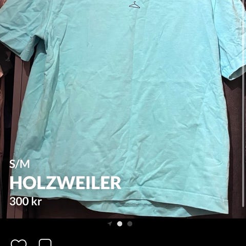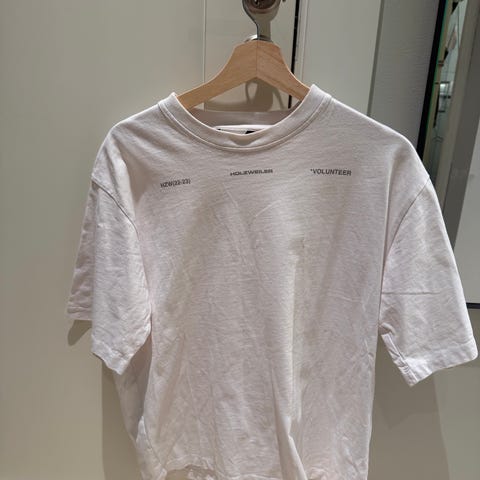 Holzweiler t-skjorte for herre i størrelse S. T-skjorten er limegrønn og laget av bomull. Den har rund hals og et lite kleshenger-broderi på brystet. Passer til hverdagsbruk alene eller under genser og jakke.