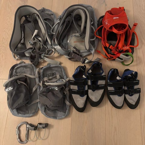 Flere par klatresko i ulike modeller selges. Kr. 150 per par, kr. 400 for alle.