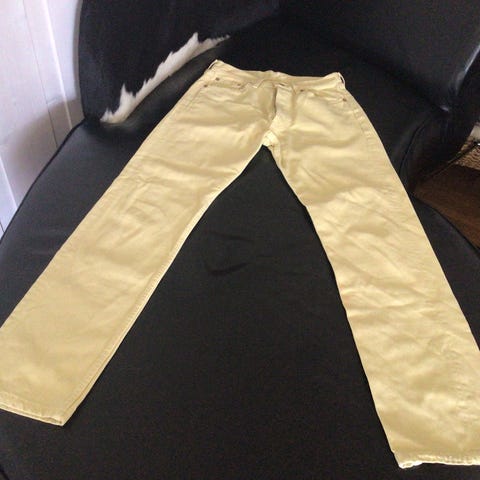 Selger denne ubrukte, knallgule buksa fordi den ikke passer. Har kjøpt den brukt selv, men den passet ikke. Det er litt stretch i den, men ikke mye. Den er produsert i Kina, og da kan ofte størrelsene være veldig små, og det er tilfellet med denne dessverre... Det står at den er 31 i livet, men jeg vil tro den er ca 27. Lengda stemmer bedre.