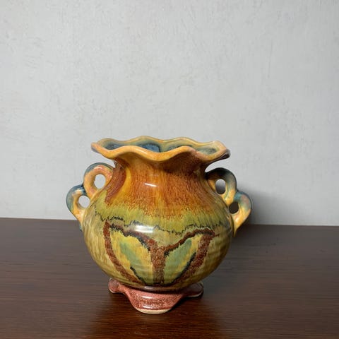 Dekorativ og særpreget vintage keramikkpotte/vase med håndmalt dekor og glasur i turkis/grønn, hvitt og brune detaljer. Formen er rund og lav, med små føtter og to sidehåndtak som gir et lekent og retro preg.