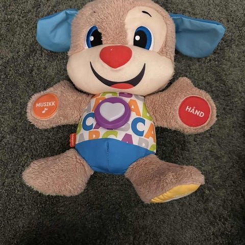 Fisher-Price interaktiv bamse leke. Myk kosedyr-bamse med fargerike detaljer og trykk-knapper på labbene merket blant annet med «musikk» og «hånd». Bamsen er laget for små barn og kan brukes til lek og enkel læring av ord, bokstaver og musikkfunksjoner. Passer som aktivitetsleke og kosedyr for barn.