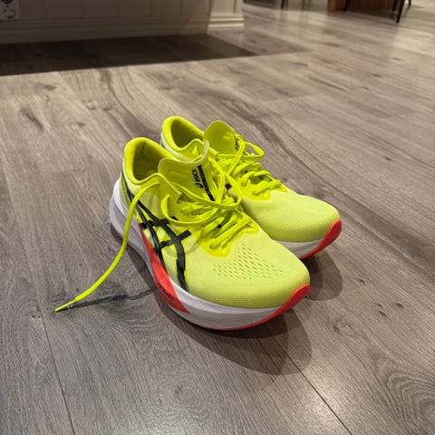 Asics Gel-Nimbus løpesko i størrelse 46. Skoene er i hovedsak svarte med detaljer i gult og hvit mellomsåle. Overdelen er i pustende tekstil med snøring. Egnet til løping og annen trening på asfalt og hardt underlag.