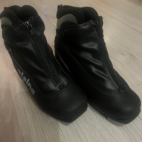 Alpina T8 langrennsstøvler for barn i størrelse 28. Støvlene er svarte med glidelås foran og overtrekk som beskytter lissesystemet.