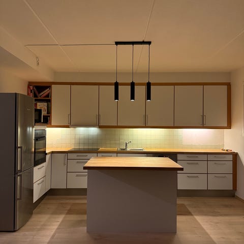 Må demonteres av kjøper. Oppvaskmaskinen følger med. Kombiskap følger ikke med men kan kjøpes.