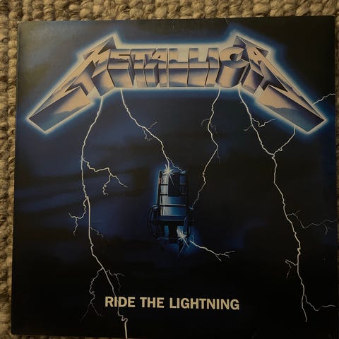 Metallica Ride the Lightning vinylplate. Albumet er utgitt på vinyl og har det karakteristiske blå omslaget med elektrisk stol og lynmotiv. Passer for samlere og lyttere som ønsker albumet i fysisk format på plate.