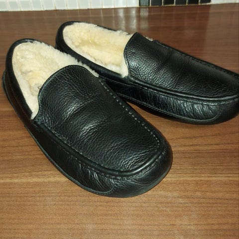 Ugg tøfler i modellen scuff. Mørkeblått skinn i størrelse 42. Gått opp litt foran i undersålen på høyre sko men kan lett ordnes med litt lim.