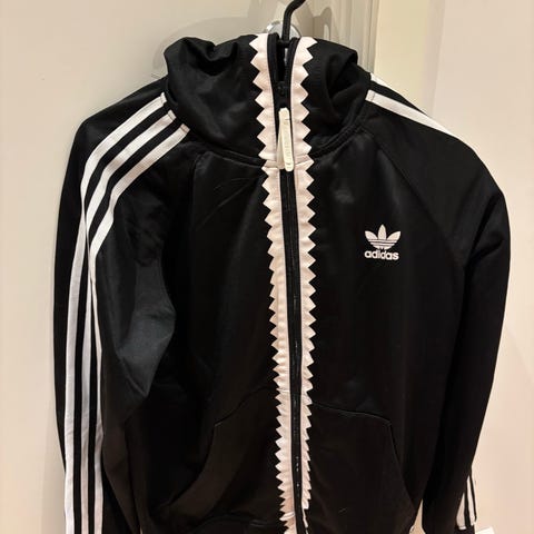 Adidas hettejakke for herre i størrelse M. Jakken er grå og laget i bomullsmateriale. Den har glidelås i front, hette med snøring og ribbestrikkede mansjetter og linning. Klassiske Adidas-striper langs ermene og liten logo på brystet. Passer til hverdagsbruk og lett trening.