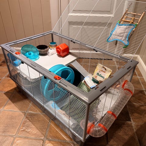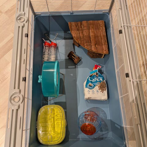 Hamsterbur med vannskål, matskål og løpehjul selges. Utstyret ble kjøpt August 2025 nytt og er brukt til ett hamster. Fremstår som helt nytt.