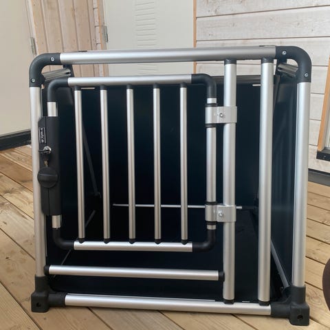 For mellomstor hund. Buret er ca 78 x 52 cm.
