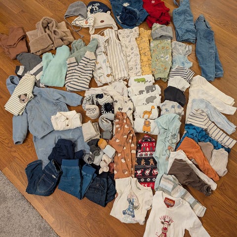 Pent brukt klespakke i bomull str 62 selges for 500 kr. 11 bodyer, de fleste omslagsbody med extension så de kan brukes lenger. 9 bukser, 3 tynne tights, 4 pysjer, 1 sparkebukse, 1 jakke med knapper, 1 penbody fra Newbie med myk joggebukse til. Her har du alt du trenger til mini sin garderobe😊 kan sendes.