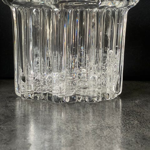 Den er laget av tung krystall med innkapslede luftbobler og et rillet utseende. Vasen har kraftig, strukturert glass med mønster som gir et inntrykk av is eller rennende vann. Åpningen er rund med svakt bølget kant, og formen er noe konisk med bredere topp enn bunn. Egner seg til snittblomster eller som dekorativt objekt i interiøret.