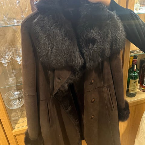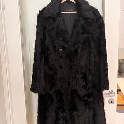 Dear Dharma ytterjakke/ kåpe i lammeskinn for dame i størrelse 38. Jakken er svart og har myk, pelset kant rundt krage og ermeavslutninger. Modellen er laget i skinn med glatt innside og utside med semsket preg. Passer som yttertøy på kjølige dager og kan kombineres med ulike antrekk til både hverdagsbruk og mer pyntede anledninger.