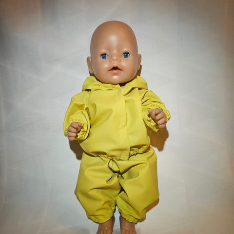 Regnbukse og regnjakke sydd i regntøystoff til Baby Born.