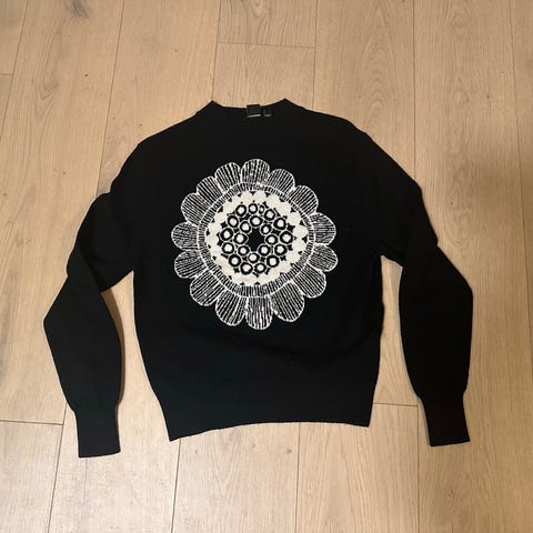 Disney genser størrelse M. Genseren er svart med hvitt Disney- og Mikke Mus-mønster over hele plagget. Rund hals og lange ermer. Mykt stoff som passer til hverdagsbruk og som et uformelt plagg innendørs eller ute i mildt vær.