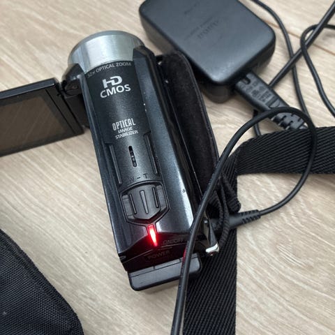 Canon Legria HF R48 videokamera i svart med innebygd Wi‑Fi og 53x avansert zoom. Kameraet tar opp i HD-video og har en utfellbar LCD-skjerm for enkel innramming og avspilling. Modellen støtter lagring på minnekort (SD/SDHC/SDXC) og har tilkoblingsmuligheter via USB og HDMI (avhenger av kabler/utstyr). Håndrem på siden gir bedre grep ved filming. Strømforsyning og en ekstern lader pluss 2 batterier følger med, som vist på bildene. Lader følger med og en veske.