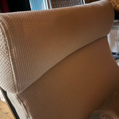 Selger en POÄNG lenestol med mørk brun/sort ramme og gråbeige trekk i en myk blanding av viskose og bomull. En veldig behagelig stol både å se på og å faktisk sitte i.