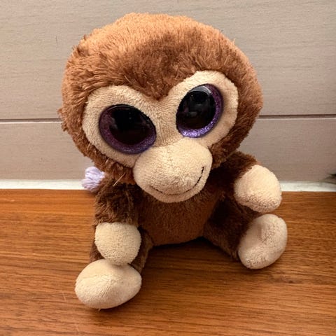 Ty kosedyr formet som en ape i brun farge med lys ansiktsside og store øyne. Myk plysj som passer som koseleke eller pyntegjenstand på barnerom. Fra et røyk og dyrefritt hjem.