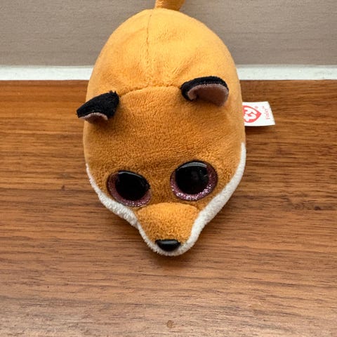 Ty kosedyr formet som en giraff. Myk plysj med brune og beige flekker, lilla øyne og liten hale. Egnet som kosedyr for barn eller som samlefigur. Fra et røyk og dyrefritt hjem.