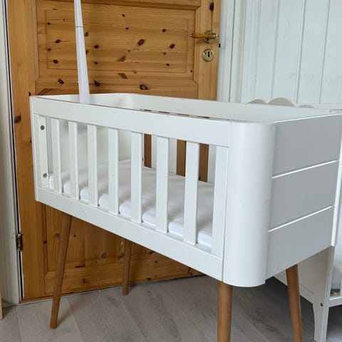 Troll Bedside crib babyseng hvit m/madrass og sengekant (Veldig pent brukt!)