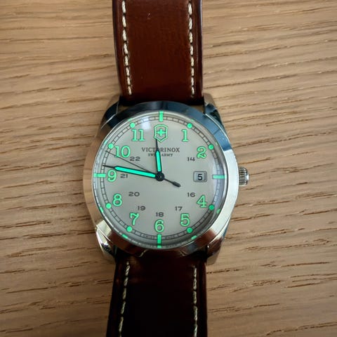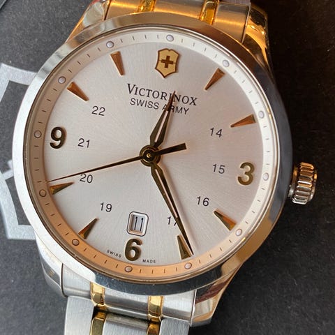 Victorinox Swiss Army klokke med kraftig lumen. Klokken har hvit skive og stål-gull lenke. Klokken er Pent brukt, så den ser fint ut. (Se på bilder)
