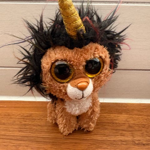Ty kosedyr formet som en løve. Myk plysjfigur med store øyne og manke. Egnet som lekedyr eller kosebamse for barn. Fra et røyk og dyrefritt hjem.