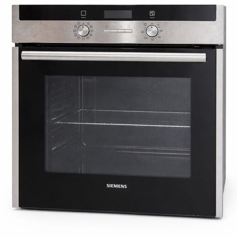 Stekeovnen har integrert varmluftsfunksjon som gir jevn varmefordeling i ovnsrommet. Fronten er i rustfritt stål og svart glass, med stort vindu i døren for god oversikt under steking. Betjeningen skjer med to dreieknapper og et digitalt display øverst på fronten.