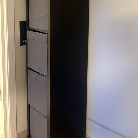 Godt brukt og litt gul kallax hylle av type gammel gis bort mot avhenting. Litt løs folie en plass men absolutt enkelt å fikse. Beregnet for 8 bokser. 4 tøybokser kan følge med.