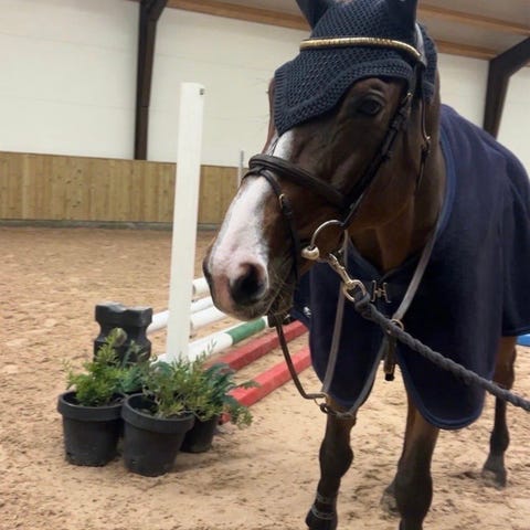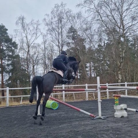 Tidligere startet opp til 135 cm, og hos meg hopper hun lett baner på 120+. Hun hopper alt på terrengbanen, er trygg i halsring, barbakk, og gjør de fleste øvelser fra bakken.