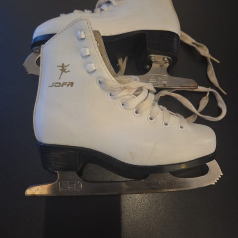 Hvite kunstløpskøyter i str 36 med dekorativt blomstermønster på siden. Skøytene har snøring med flere maljer og stålklinge med tagger foran. Passer til bruk på isbaner og skøytebaner for fritids- eller enkel kunstløpsbruk. Levering i Oslo kr.100.
