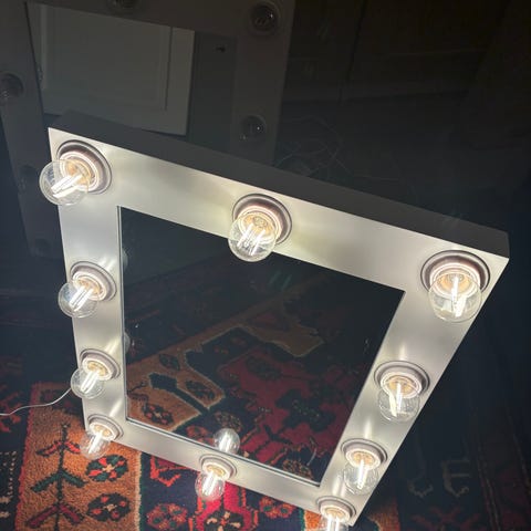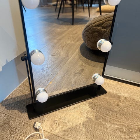 Speil med integrerte LED-lys langs kantene. Rektangulær speilflate montert på fot som kan plasseres på bord eller benk. Egnet som sminkespeil eller til generell bruk der det er behov for ekstra belysning rundt speilet.