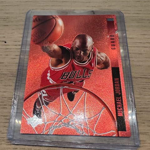 Upper Deck Now Appearing Michael Jordan samlekort. Kortet viser Michael Jordan i Chicago Bulls-drakt på forsiden, med grafisk design i svart, hvitt og rødt. Baksiden er utformet som en billett med tekst om spillerens meritter. Kortet er fra serien Now Appearing fra produsenten Upper Deck og tilhører basketball-kategorien. Egnet for samlere av sports- og basketballkort.