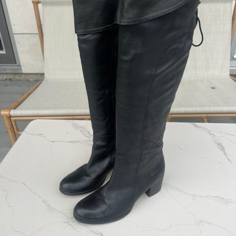H&M støvler i størrelse 36. Støvlene er svarte og går over kneet, med blokkhæler og avrundet tupp. Sålen er i syntetisk materiale. Passer til bruk i hverdagen eller til penere antrekk i kjøligere vær.