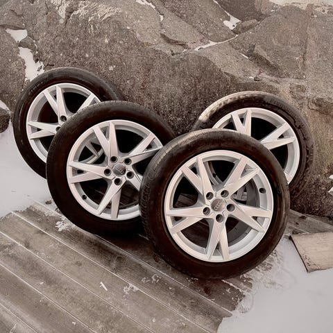 Felger er veldig fine, og dekk er bra, uten om venstre bakhjul, da jeg hadde et uhell tidligere i vinter med et hull i veien jeg ikke så, dekk er revnet, og felg er litt bøyd, se bilder