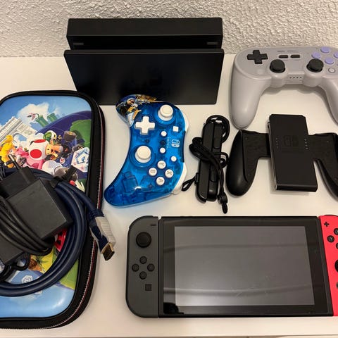 Nintendo Switch spillkonsoll med Joy-Con-kontrollere i fargene neon rød og neon blå. Konsollen kan brukes både håndholdt og tilkoblet TV via dokkingstasjon (ikke avbildet). Bildene viser selve konsollen med skjerm, to Joy-Con-kontrollere, Joy-Con-håndleddsreimer, Joy-Con-grep og strømadapter. Egnet for én eller flere spillere, både hjemme og på farten. Selger denne fordi jeg ville prøve ut den nye å ikke har bruk for 2 stykk. Brukt en del men holdt den i velstand og tatt godt vare på, brukt å frakte den i en mappa for å ikke ødelegge den på farta.