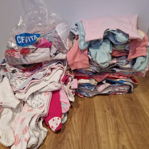Fra str 50 til 3 år. Har du lyst til å komme og se, så send meg melding. Selges billig. Fra kr 20 pr plagg. Masse bodyer,bukser,dresser......osv...