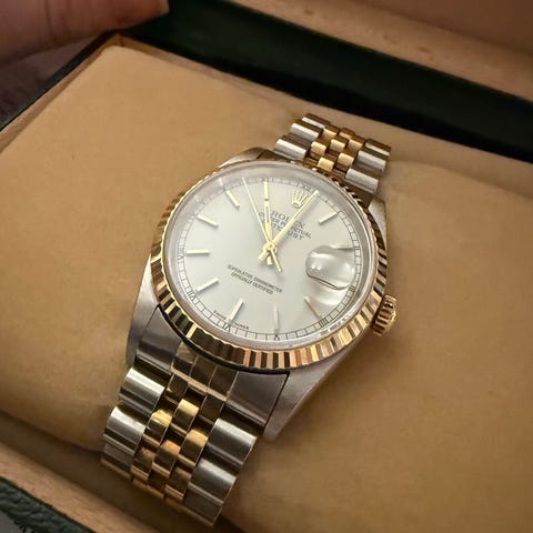 Modell: Rolex Datejust Ref.nr: 16233 Urkasse: Stål Lenke: Stål og 18k gult gull År: 1991 Bevegelse: Automatisk Diameter: 36 mm Skive: Champagne skive Glass: Sapphire Bezel: 18k gult gull