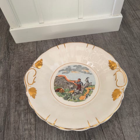 Norsk Flint, Egersund, vintage fat, vintage tallerken, keramikk, norsk porselen, Made in Norway, retro servise, dekorfat, serveringsfat, dyp tallerken, bonderomantikk, norsk motiv, tradisjonelt motiv, gullkant, samlerobjekt, retro interiør, 50-tall, 60-tall, 70-tall