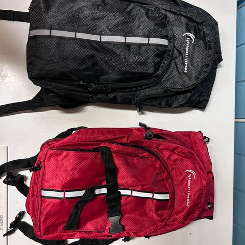 Byggmakker ryggsekk i rød og svart farge. Brukt bare en gang. Rent. Regntrekk følger med. Svart veska godt brukt, men har ikke defekter.