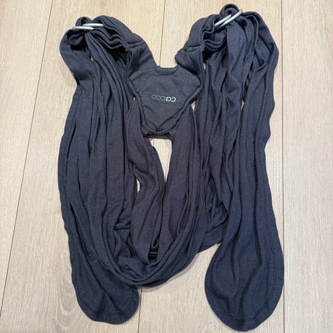Caboo close baby carrier bæresjal/ringsjal. Eldre modell med noen bruksmerker, men fullt fungerende! Selges billig. Se bilder. Finner et lite hull i stoffet, og har sydd noen sting i en oppgått søm på innsiden av «trekket» som festes rundt baby. Ingen av delene ødelegger noe funksjon, men er greit å vite om☺️