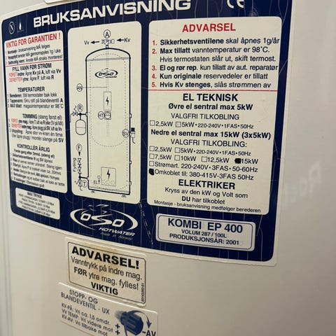 OSO EP 300 dobbelmantla varmtvannsbereder med volum på 198 + 120 liter og effekt på 5+15 kW. Vært i drift til i denbe uka, Varmtvannsbereder gir 198 liter varmtvann (indre tank) for dusj etc + 120 liter (ytre tank) for sirkulasjon i gulv, totalt 318 liter. Pent brukt , vært i drift fram til denne uka. Byttes til smart bereder tilknytta ny varmepumpe med akkumulstor-tank.