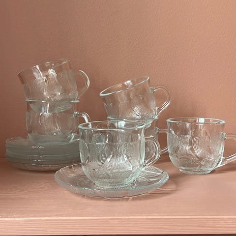 "Aspen Leaf" - 4 sett Kopp og skål , pent brukt, fra Arcoroc . Klart, herdet glass med et preget bladmønster, produsert i Frankrike. Fra 70-80-tallet, men i god stand.