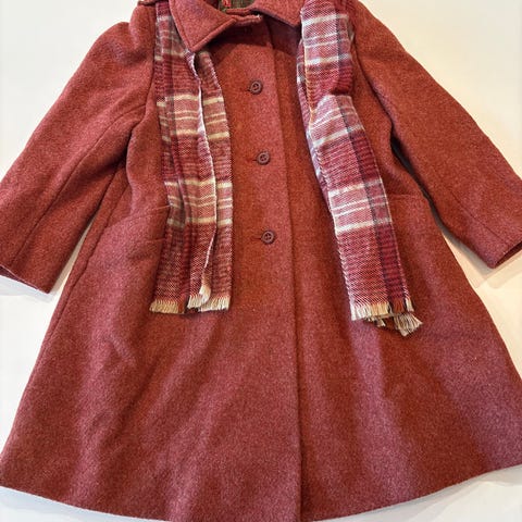 Nydelig ullkåpe kjøpt på Myrullpikenes landhandleri. Denne er sydd for hånd og laget med kjærlighet. Målene står på bildene. Dette er en kåpe som kan brukes lenge, da den kan brettes opp på ermene.